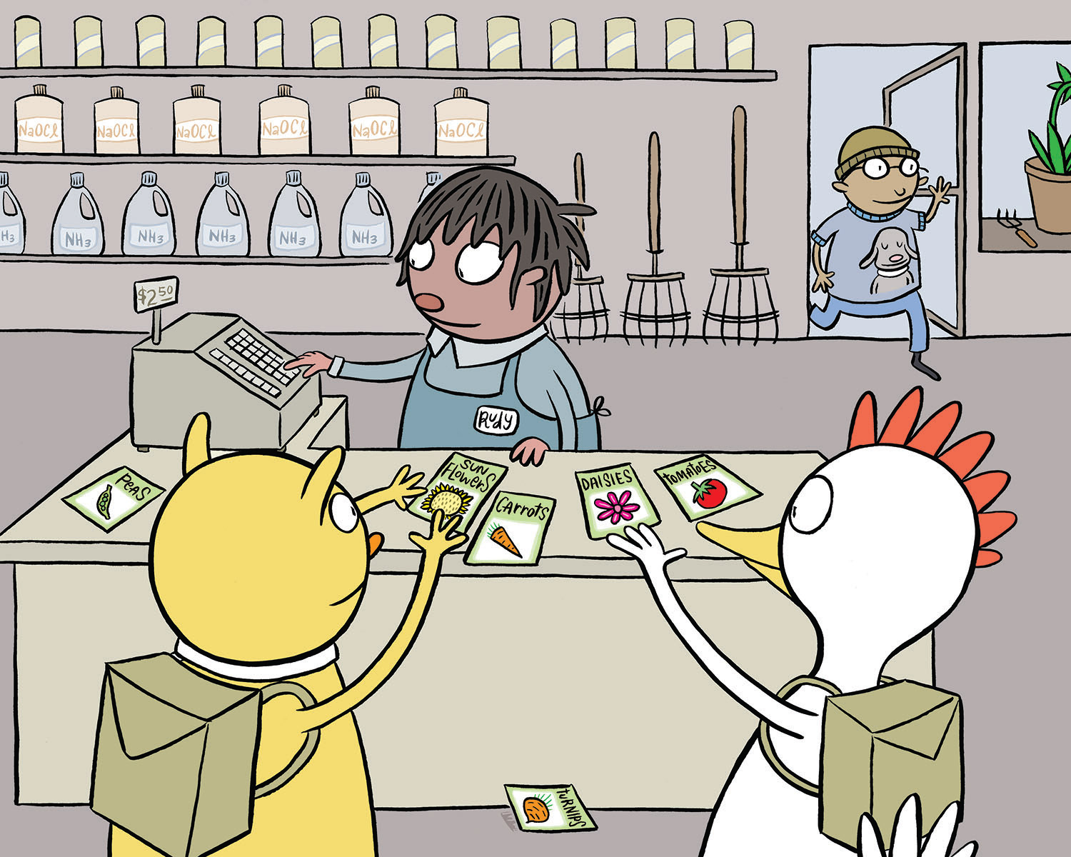 Follow Chicken and Cat as they venture out of their dreary urban neighborhood in search of color. Hardcover picture book, 40 pages.